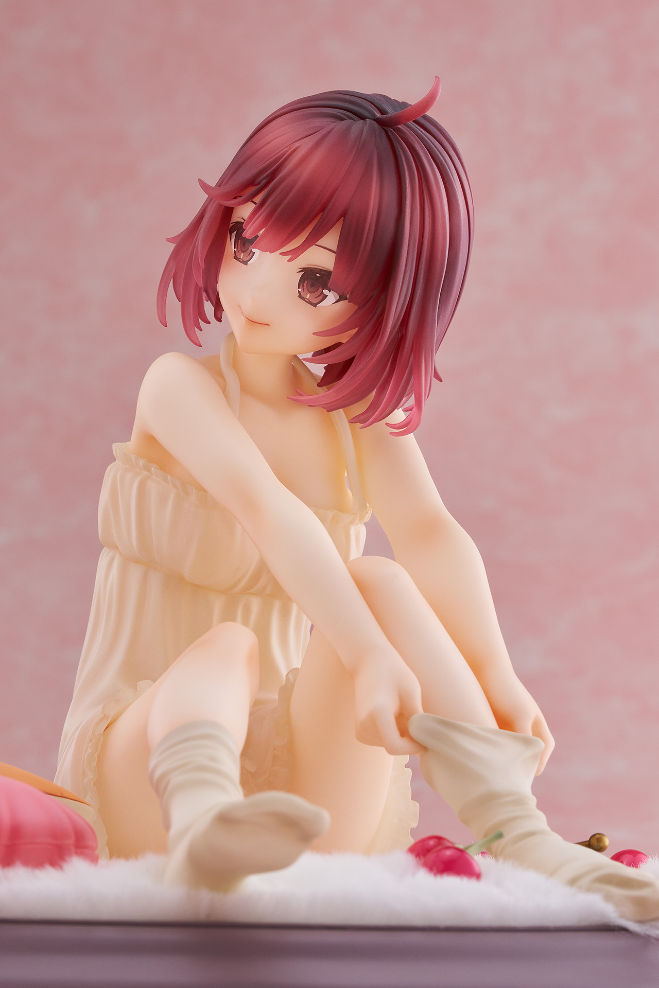 靴下を履くポーズを「靴下を上げる手先」「広がる靴下の履き口部分」「余ったつま先」と、イラストを忠実に再現。たくし上げる両手や靴下の質感が、動きも感じさせてくれる造形になっています。