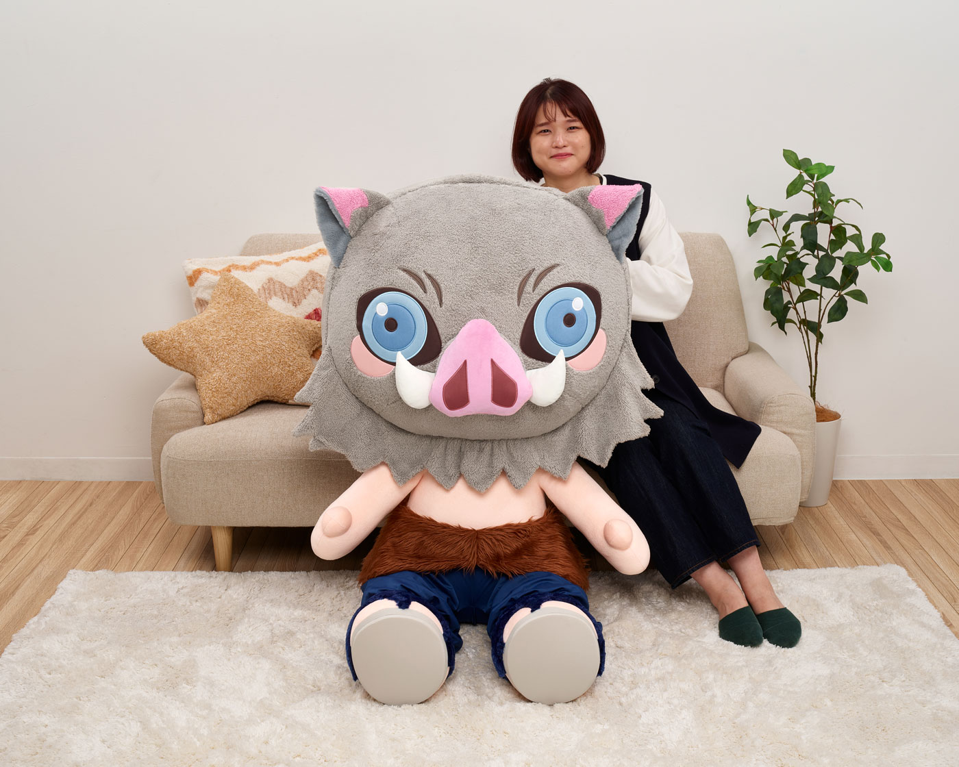★おすすめポイント②「“きゅーと”なデザイン」 超特大ぬいぐるみならではの愛らしいデザインにアレンジ。嘴平伊之助の野性的な瞳にも注目!