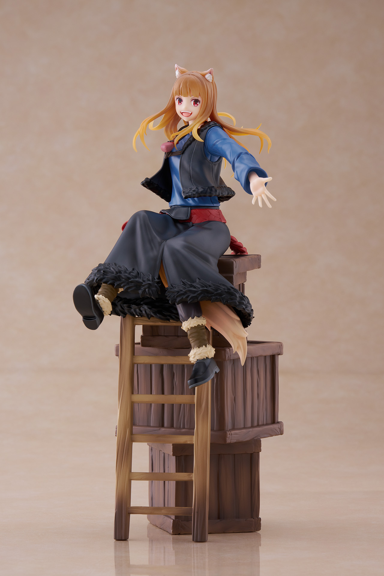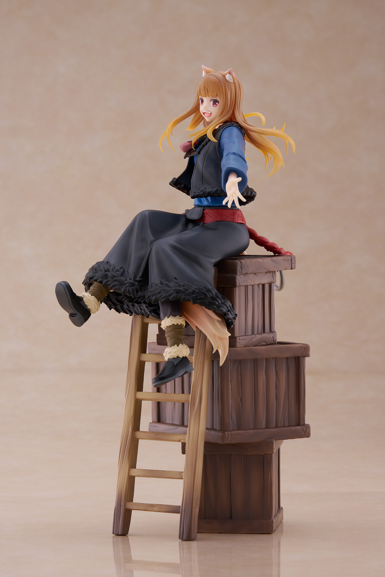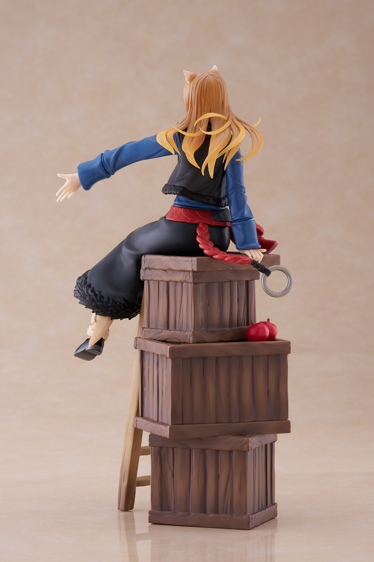 木箱やはしご、"ホロ"の好物のりんごを組み合わせた台座となっており、作品の世界観を表現しています。