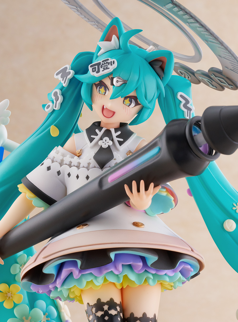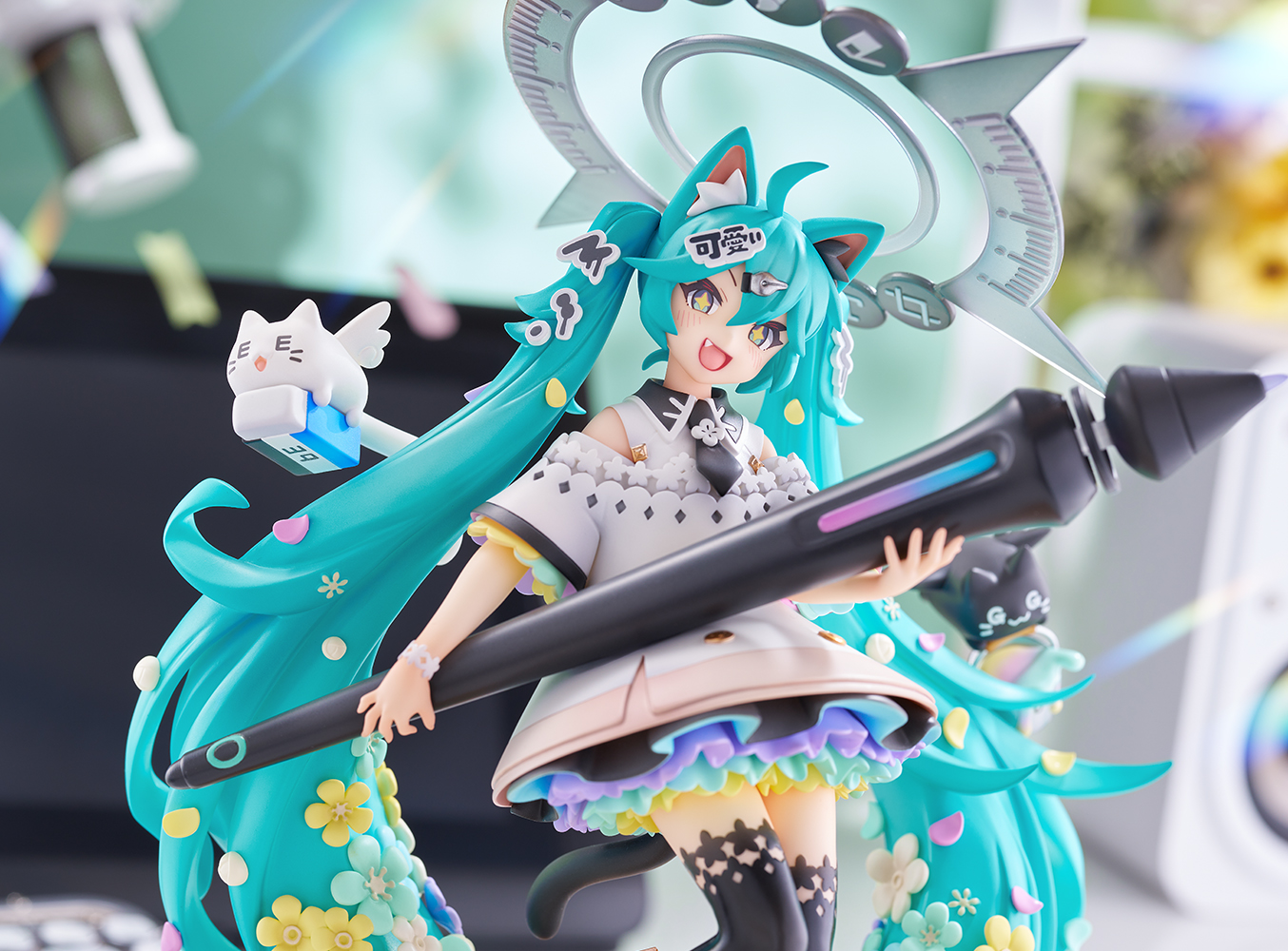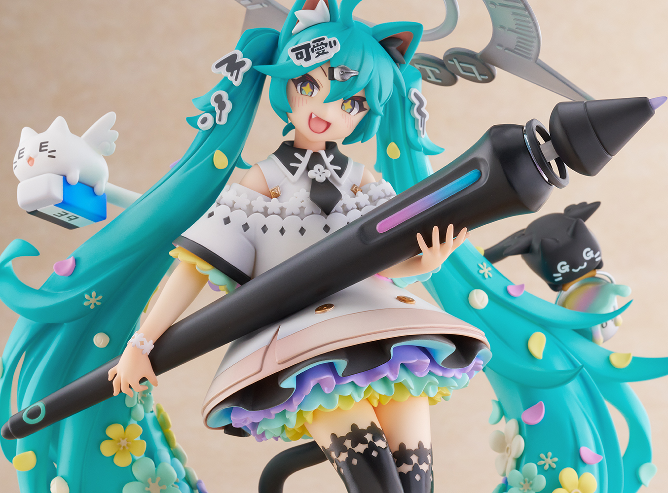 本作は「お絵描き」をテーマに、カラフルなお花や画材を思わせるモチーフが各所に配置されており、額縁からミクが飛び出してくるような表現も大きなポイントです。